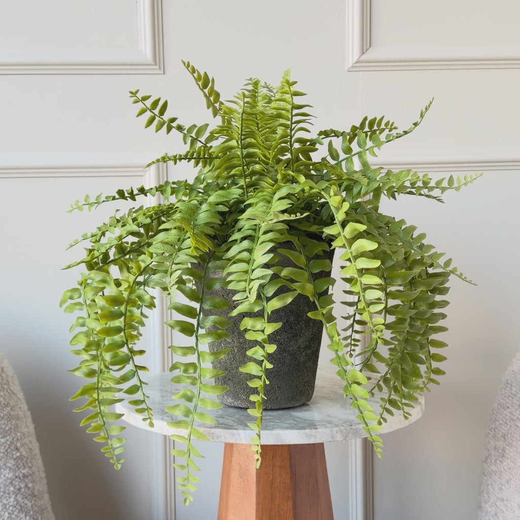 At 65cm wide, this is a generous plant. The fronds spill well over the edge of the pot, making it ideal for a side table, bathroom vanity or shelf where the trailing shape can really be seen. The textured grey pot keeps things understated and lets the foliage do the work.