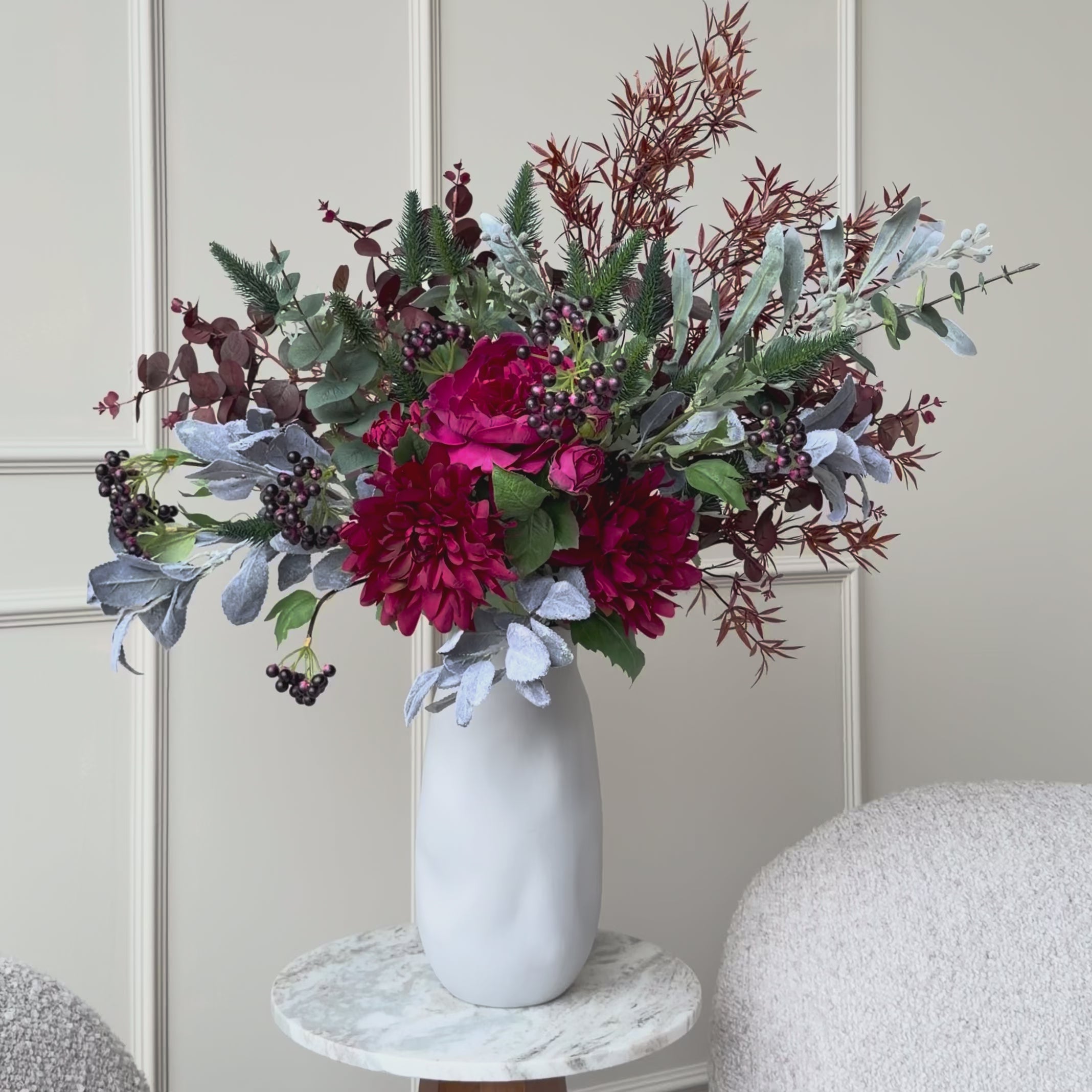 The colour palette here is built around deep wine-reds and fully commits to them. Dahlias with velvety, layered petals sit alongside an English rose in the same rich tone, and the foliage picks it up and carries it outward.