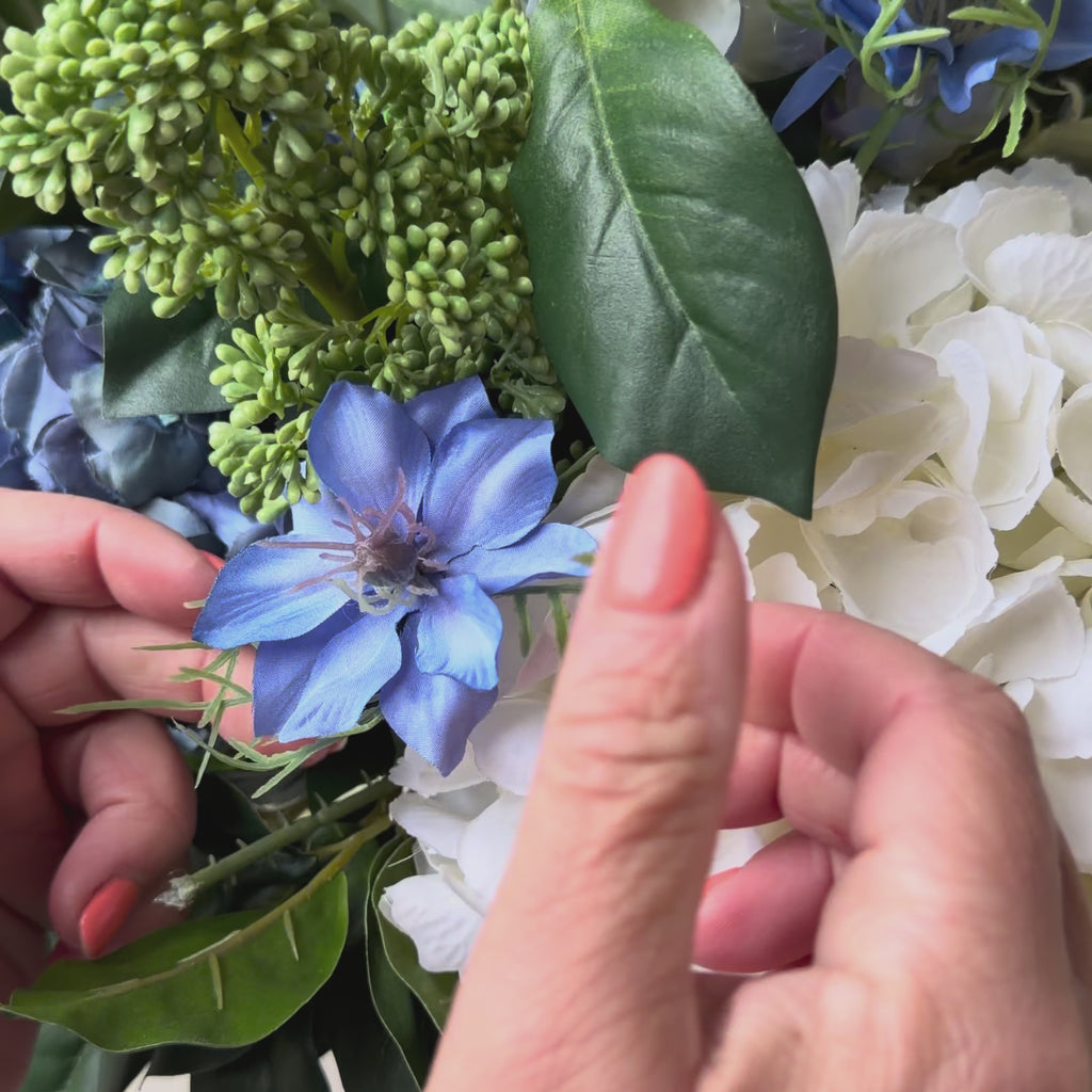 A blue dried hydrangea sits at the centre with deep, layered petals that shift from navy through to softer cornflower tones. Beside it, a white hydrangea opens generously with that natural droop and petal variation that makes ours so hard to distinguish from fresh. Together, they carry the visual weight of the arrangement and set the palette.